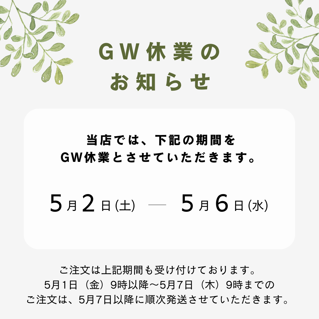 休業前の商品発送は、2026年5月1日(金)9時までのご注文にて締め切らせていただきます。